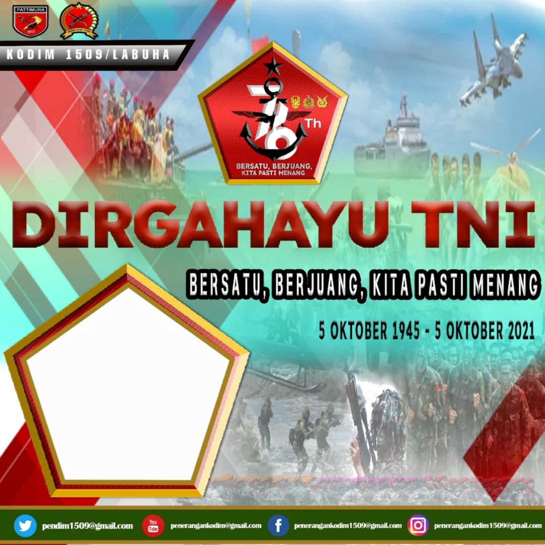 Dirgahayu Tentara Nasional Indonesia TNI ke-76 Tahun 5 Oktober 1945-2021 Bersatu Berjuang Kita Pasti Menang DirgahayuTNI DirgahayuTNI76 HutTNI76 TNIAD TNIAL TNIAU TNIKeren BersatuBerjuangMenang Ritam98 IndonesiaRaya Indonesia. Sebentar lagi bangsa Indonesia akan memperingati HUT ke-76 RI pada Selasa 17 Agustus 2021. Di bawah ini link twibbon HUT TNI yang bisa dipasangi foto dan diupload untuk status di whatsapp ataupun media sosial medsos sebagai bagian memperingati hari lahirnya tentara kebanggaan kita.